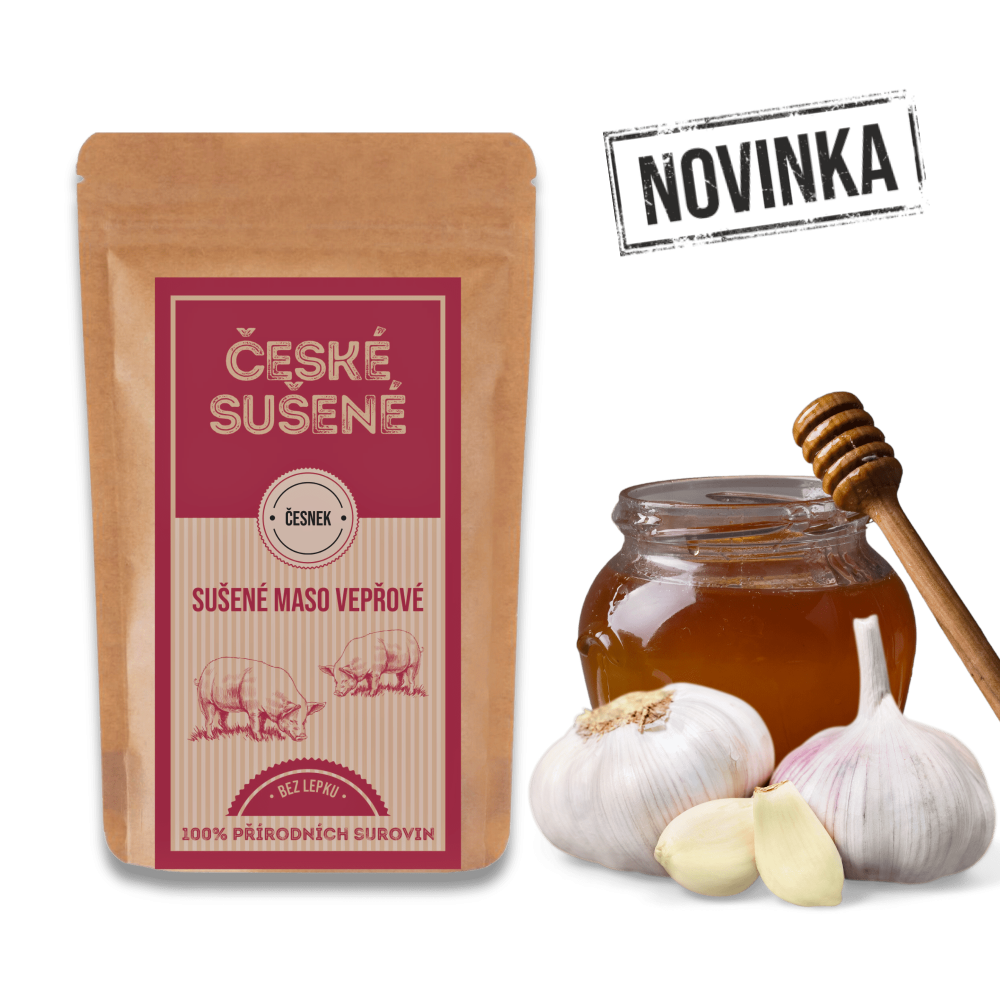 Sušené vepřové dochucené českým česnekem, medem a špetkou petrželky. Neskutečná dobrota a ta vůně, když otevřete sáček!