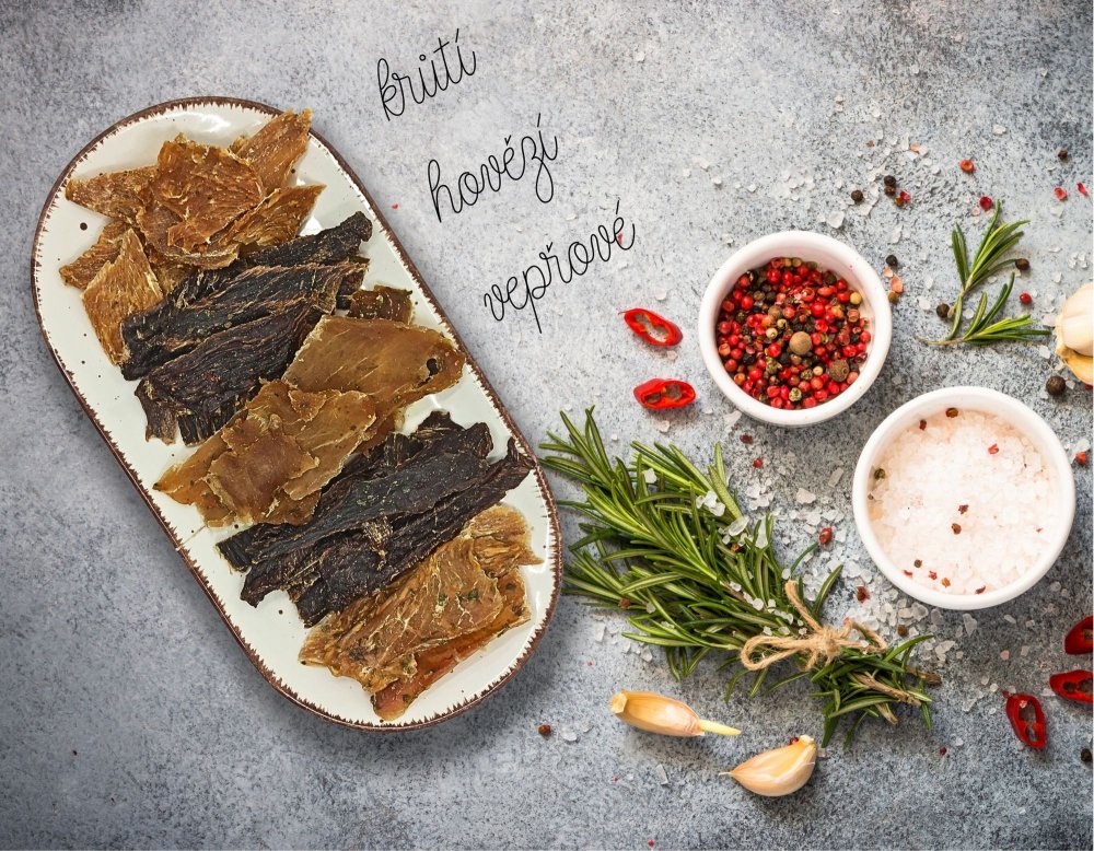 Hovězí a vepřové maso pochází z Měřína na Vysočině. K výrobě sušeného masa používáme kýtu a zadní váleček.